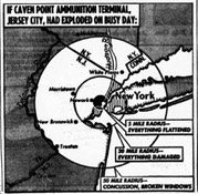 The Coast Guard seamen also knew that the potential for a disaster in New York Harbor was far deadlier than Halifax, with an explosive force that could obliterate the port, portions of New Jersey and New York City and hundreds of thousands of residents. Two nearly full ammunition ships, flying the red Baker flag for “hot,” were moored near El Estero and a line of railroad cars on the pier held an additional shipment of hundreds of tons of munitions for a total of over 5,000 tons of explosives. Add to this the nearby fuel storage tank farms at Bayonne and Staten Island and obliteration appeared likely for the nation’s largest population center, including swaths of Jersey City, Bayonne, Staten Island and New York City.