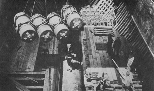 A member of an Explosives Loading Detail monitors the loading of high explosives and the work of carpenters as they construct the bombs’ wooden framework in the ship’s hold. U.S. Coast Guard photo.
