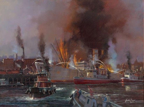 Rendering of the El Estero fire painted by noted marine artist Austin Dwyer. (Courtesy of Austin Dwyer)